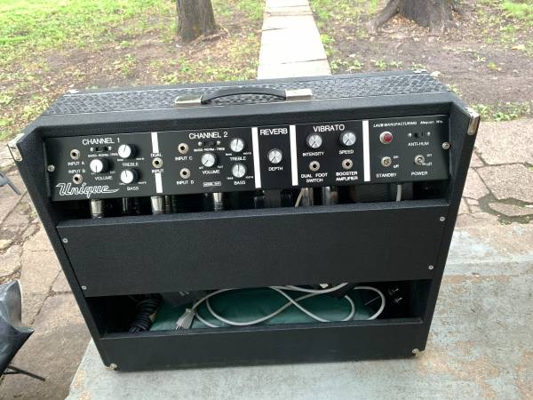 Vintage 1977 Laub Manufacturing Unique 26R tube combo amp in nice condition. One of the rarest Magnatone off-brands, Laub of Mequon, WI continued to produce Magnatone-licensed amplifiers long after Magnatone called it quits. The 26R is based on the Magnatone 460 circuit with a few minor changes to account for different tube types. It features the same pitch-shifting vibrato, long-spring reverb and organic, tweed-esque tone of its Magnatone-produced cousin. This amp has been cleaned and serviced. It is fully functional. Includes original slip cover.