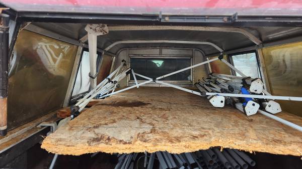 Topper is in nice shape. The rear struts/prop rods have lost their charge and should be replaced. Any Napa or auto parts store will have these for $15 each side. Comes with clamps as shown.