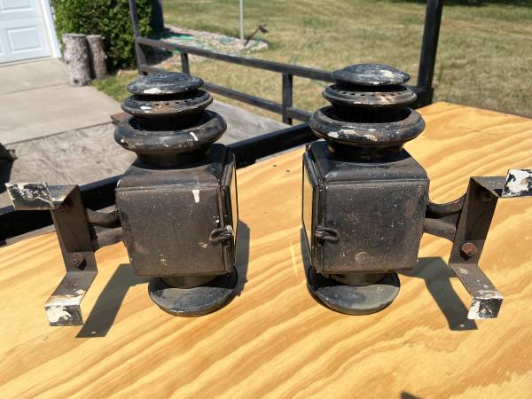 Excellent condition, glass is intact and the hinges work fine, no corrosion or kinks. The wick adjusters rotate freely but each of the release nuts for the tanks are painted over so I didn't mess with them. The extra brackets were added to mount on a house.