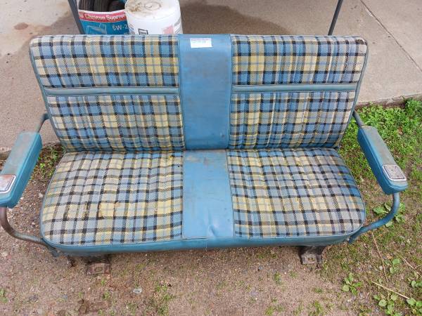 Original rear seat from mid 70's Chevy Blazer. Blue plaid vinyl & cloth, Free if you buy the 75 Blazer & Myers plow, Which is still pretty solid. Minor rust. Needs the 2-bl carb rebuilt, 350 engine, Had trans gone threw about 3 years ago. used only as a shop truck. Never got a title,(being it was built out of 2 separate trucks about 20 years ago), 3,000.00. seat only 80.00. "Calls Only" all others will be ignored. Still for sale.