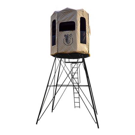The Rinoz RZ-10 elevated soft-shell hunting blind system is a special model made to deliver a more cost-effective elevated hunting product while not sacrificing in quality that hunters demand from their equipment. With a removeable (replaceable) waterproof cover with blacked-out exterior windows and magnetic window mesh fixtures, this blind will be one well appreciated for the archer and gun hunter alike. The blind's tower is a combination tower that allows the user to install as either a 5' or 10' setup.
