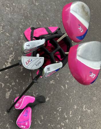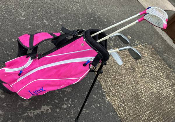 Lynx LX Jr Girls Set Driver, 3 wood both with headcovers, 7 Iron, PW & Putter Pink Stand Bag. Golf Players 48 - 51"estimate. See photos for condition. FCFS