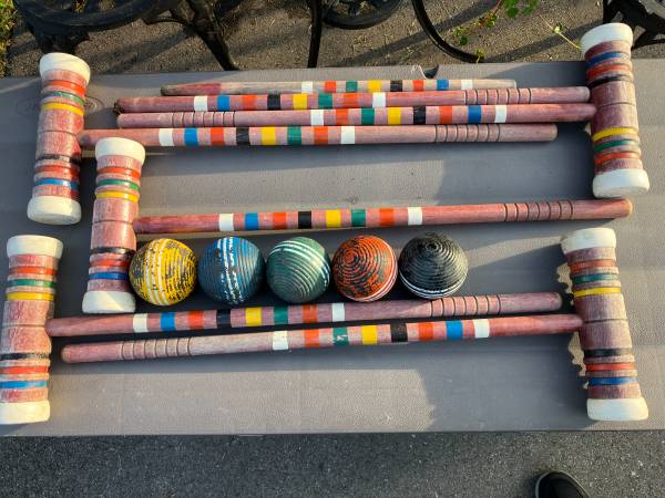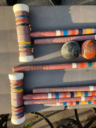 5 mallets and balls. NO hoops. 1 stake and one mallet handle that has been used for a stake. I have seen 9 hoops on amazon for $10. The set looks like it has been stored outside, but the rubber on the mallet heads look almost new. I put all the pieces in the bag for travel.