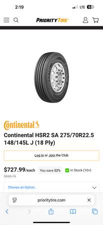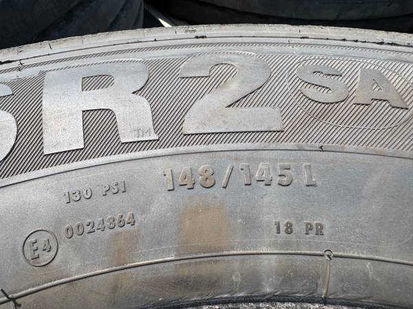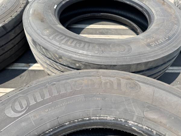 Have 6 available. 275/70R22.5 Load Range J (18ply). I believe all are matching Continental except 2. Lots of tread left. $120 each, take your pick.
