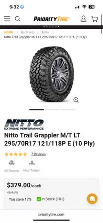 Selling a full set of almost new nitto trail grapplers. 295/70/17 on black 17” 6 lug xd series rims. Asking 1750.00 OBO. Willing to trade for smaller/less aggressive rims and tires as well in good...