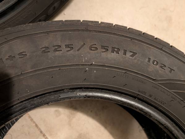 I have a pair of Goodyear assurance a/s 225 65 17 with right around half tread. Asking $60 cash for the pair. Texts are preferred but if you want to call just leave a message. Please specify which tires you are looking at. No message no returned call. Thanks for looking!