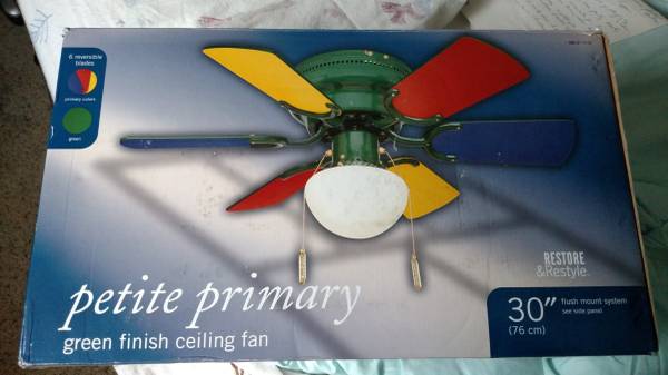 NEW!!! Never Opened - 30" Primary color fan with flush mount system and six reversible blades with glass light kit - three speed forward/reverse Use for child's bedroom, game room, or man cave!!!...