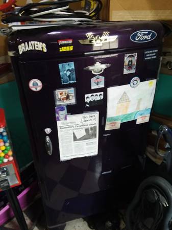 Hey Gals/Guys, we have a few cool items for yr getaway places. Old time Frig 500 , old time clocks 300, old time furniture, old time Coke coolers 500, white cooler still cools, red coke cooler is only a cooler, u must use ice, has drain plug and shelf underneath, 8-trac tapes, players, will take other cool stuff on trade should you have. 2a stuff,bullies, cash silver etc. 1964 Fairlane station wagon tailgate, We are using the white Coke machine right now. Garage frig for pop, beer keeping leftover food from party. We have the backend cut from a 57 Ford Fairlane 500.