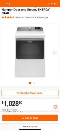 Never used Maytag electric dryer. Model #MED7230HW3. Hamper style door, has two small scratches on lower left front from transport. I needed a gas dryer wife bought wrong one from an appliance shop that’s no longer in business. I posted two photos.. one of actual machine and one at Home Depot. Very motivated seller will take offers.
