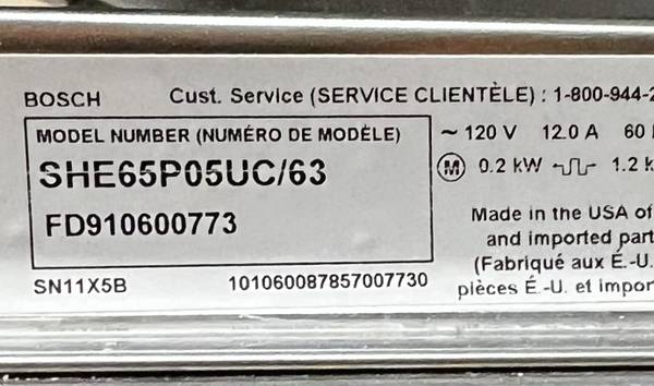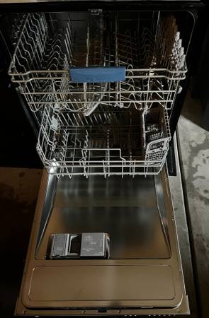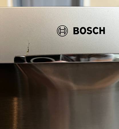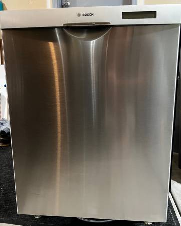 Bosch Series 500 dishwasher with full stainless-steel front and tub. Good condition overall (12 yrs old) with a few places on the racks where the coating has separated and the handle has a very small crack (See pictures). Quiet and it still works great. The only reason for the replacement is because we purchased a new refrigerator. Dimensions: 23 9/16" (W) x 22 9/16” (D) x33 7/8” (H). All hoses and power cord included.