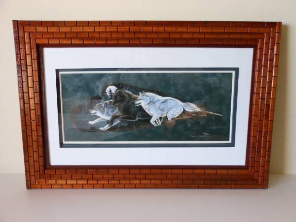 This artwork is titled "MOONLIGHT RUN" it is a 2007 print numbered 268/500 and is hand signed by the artist. The frame size is 24" x 16". There are 3 mats on the artwork-Off White, Blueberry Blackcore, and Sparkling White Blackcore. The tiles are