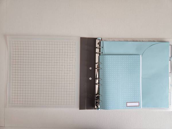 This is a new Martha Stewart 14 inches by 15 inches 8 ring binder. The 8-ring binder comes with 4 dividers with a spot to show contents on each divider page, a CD holder page, 5 clear plastic sleeves, a pop-up box, two sheets of self-adhesive tab labels, and an 8 inch by 10 inch lined notebook. All this fits in the binder with an elastic blue strap to keep it together.