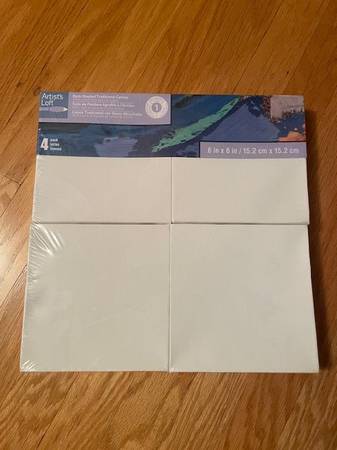 4 pack 6x6 Canvas by Artist Loft - NEW in packaging - from a smoke-free, pet-free home. White, 6 inches x 6 inches, 1.5 inches profile, cotton canvas, acid free, back stapled. $12 cash only.