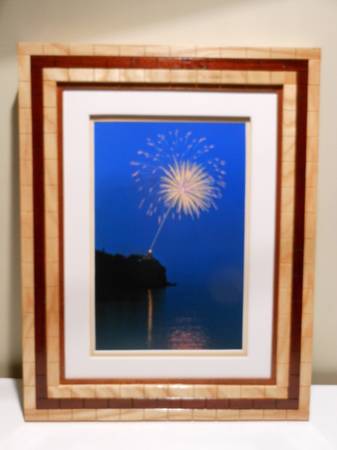 Artwork is titled "CENTENNIAL CELEBRATION SPLIT ROCK". It comes with a C.O.A. Frame size is 19" X 24". There are 2 mats on the artwork-Sand, and Vivid White. The wood tiles are 1/4" X 3/4" X 1 1/2" and are made from 1 row of White Ash and 1 row of Paduck and 1 row of White Ash. The trim is Cherry. All woods used are either reclaimed or from sustainable growth forests.