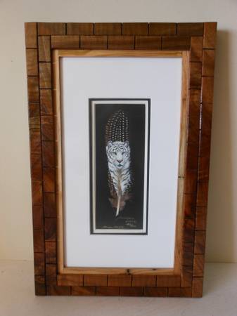 Artwork is titled "AURORA SPIRIT". It is a 2009 numbered print 153/500 and is signed. Frame size is 10" X 17". The wood tiles are 1/4" X 1/2" X 1" and are made from Red Oak grown in Minnesota and they are stained Jacobean. All woods used are either reclaimed or from sustainable growth forests.