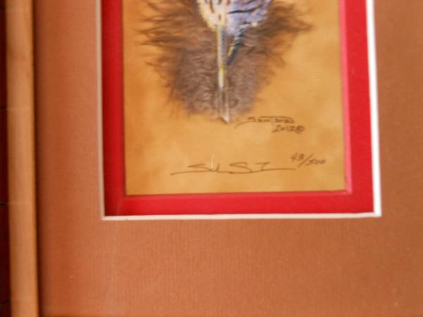 Artwork is titled "DESERT VIGIL". It is a 2012 numbered print 43/500 and is signed. Frame size is 12" X 17". The wood tiles are 1/4" X 3/4" X 1 1/2" and are made from Purpleheart grown in Central America. The trim is Maple Ambrosia grown in USA. All woods used are either reclaimed or from sustainable growth forests.