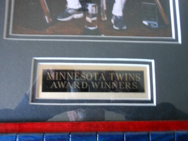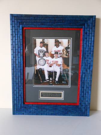 Photograph of the Minnesota Twins All Stars the year all 4 won titles. Frame size is 18" X 22". The mat is 2 layers of Black. The wood tiles are 1/4" X 1/2" X 1" and are made from Red Oak. The trim is Red Oak both are tinted Minnesota Twins colors. All woods used are either reclaimed or from sustainable growth forests.