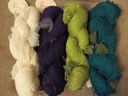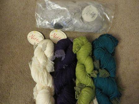 Universal Yarns, Nettie—45% cotton, 45% acrylic, 10% polyester—5 hanks in different colors. 100g/3.5 oz., 140 m/153 yds. Dark teal green, lighter olive green, deep purple, and white are still wrapped and tied. Gray is coming undone, but not in a tangle. $20 for all 5.