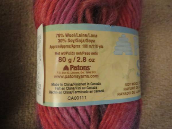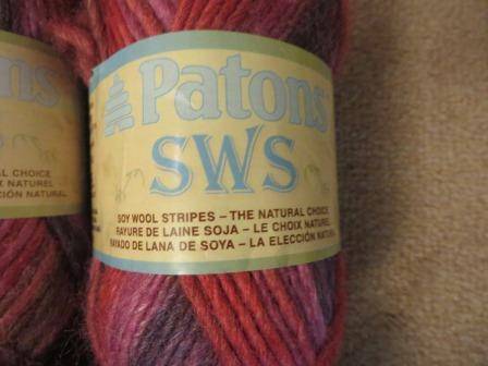 Four skeins of Patons SWS yarn (soy/wool combo--70% wool and 30% soy. 2.8 oz each and 110 per skein. Color Natural plum (a red/burgundy/purple blend--beautiful). All new in wrappers. $18 for all...