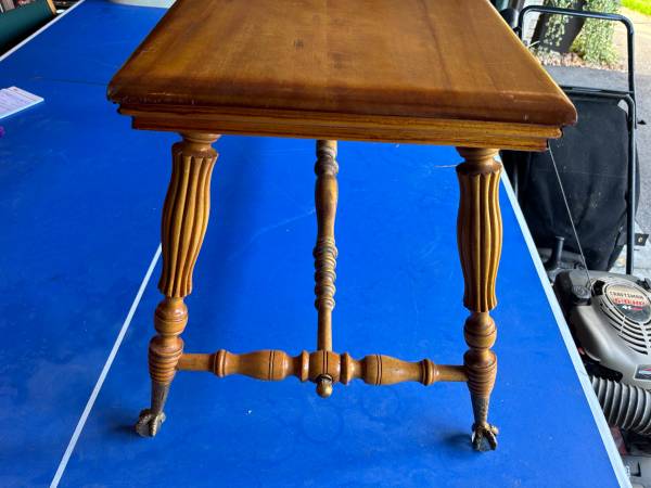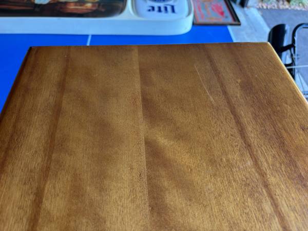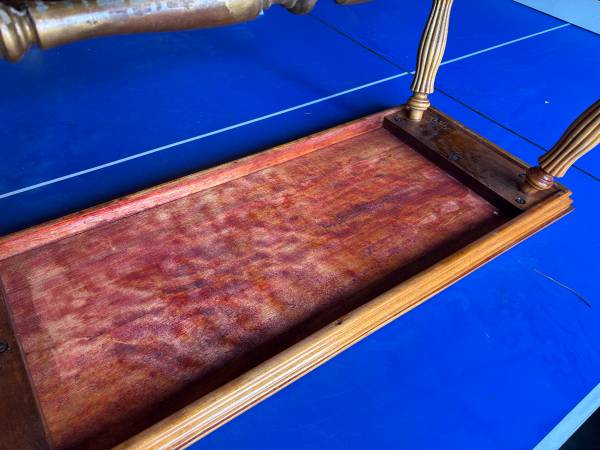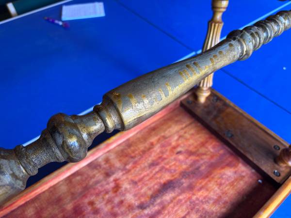 Has been re-finished, poorly - newer clear finish, lower sections partially painted with some goldish paint or stain