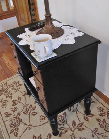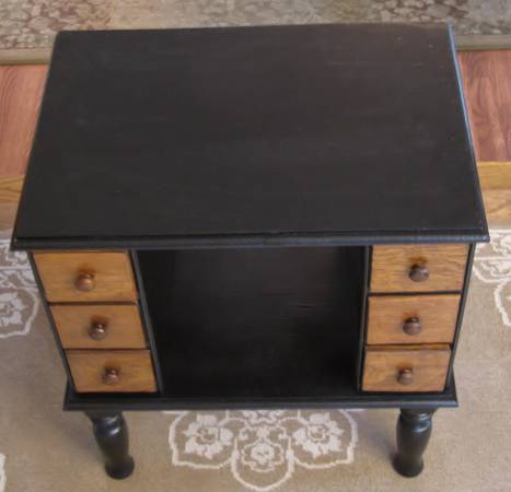 Side Table With Six Sewing Machine Drawers * Oak Construction * The Drawers Have Been Lightly Sanded & Freshly Stained * The Casing & Legs Have Been Freshly Painted With Rust-o-leum Canyon Black Paint * The Entire Exterior Has Been Given Three Coats Of Polyurethane To Protect The Wood * The Approximate Overall Dimensions Are: 25”H x 21.75”W x 15.5”D * Approximate Drawer Dimensions: 3”H x 3.5”W x 11”D * Approximate Dimensions Of The Opening In The Center: 13.25”H x 10.5”W x 14.25”D