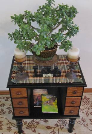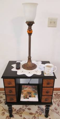 This Table Is Not A Perfect ‘Shiny New” Piece Of Furniture. With The Exception Of The Legs The Oak Body Is From An Antique Singer Sewing Machine (Around 100 Years Old). The Bottom Left Drawer Has A Minor Repair On The Edge (See Photo). The Oak Legs Are From A Vintage Table. It Has LOTS Of Character & Charm ~ A Very Unique Piece That Has Been Given New Life. It Would Make A Great Side Table * Plant Stand * Picture Table With Storage, Etc….