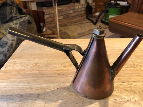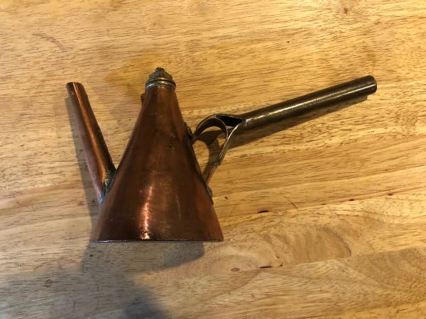 Estate found Western Pennsylvania with other old mining items, exact composition and use unknown to me. Weighs 1lb 5 oz. Cap is embossed GH on two sides as shown. Visible wick has not been removed for inspection. Measures approximately 9 3/4" from tip to handle and 5 1/2" tall.