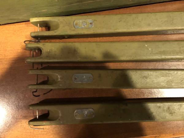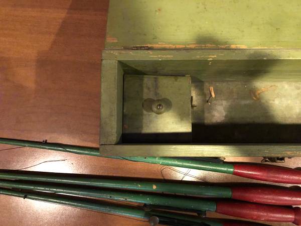 4 Antique/primitive handcrafted ice fishing Rigs with case. The workmanship is exceptional! Rods are all made of wood. Unique stainless end eyes on each pole. The 1-1/4" x 24" poles are contoured for a rocking cradle for the rods. All rods and poles have metal stamped numbers for corresponding parts. The wood case has a small compartment at one end. There are (3) extra float paddles and pins. Case is 29-1/2" x " deep x 6" high (7" with a leather carrying strap). Great for cabin décor.!