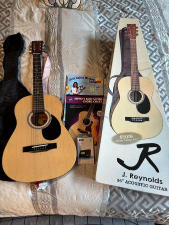 J. Reynolds JR15 36" Student Steel String Acoustic Guitar with Bag and Books and Tuner. Guitar is in excellent condition. Bag has a tear towards the bottom. Cash Sale Only.