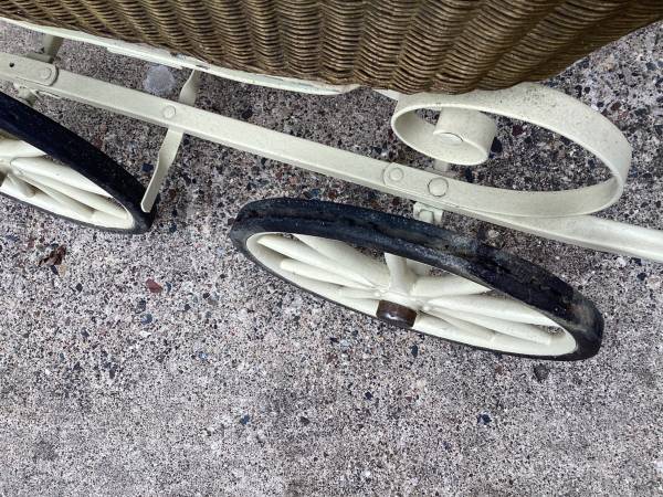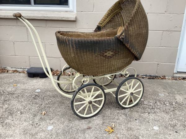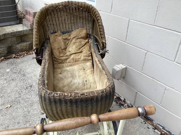 Antique baby buggy. Wicker type outside. It is lined, but needs cleaning up a bit. Cute. H= 40”, L= 47”, W= 21” Cash only