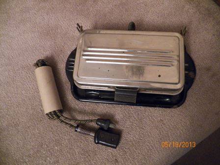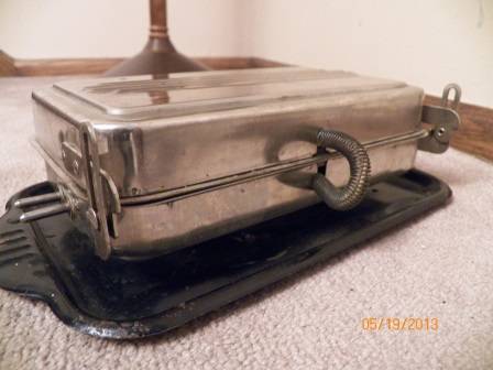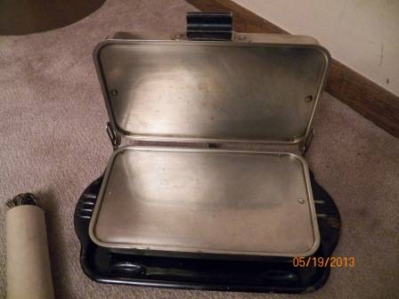 Vintage sandwich / Panini grill / toaster. Can't find a brand name on this. Silver with black front handle and black tray for carrying when hot. Expandable hinge to accommodate thick sandwiches. Griddle is 9 x 5" and tray is 12 ½ x 7". Clean and heats up nicely. Old style cloth covered cord with no fraying or breaks. Belonged to my parents, wedding gift in 1941. $20.00