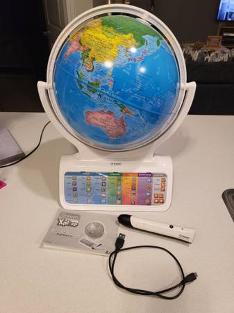 Like New Oregon Scientific Smart Globe. Has a side pen holder for storage. Also comes with USB cord for pen. Comes with instructions. Kids love touching the pen on all the different states & countries and hearing all the info about it. Very Educational and fun!