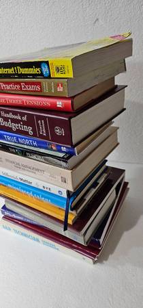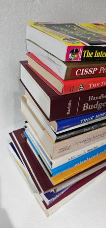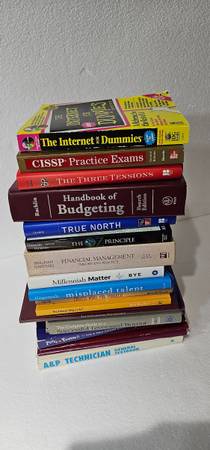 A&P technician general textbook, tricks, the complete guid to a successful leveraged buyout, amazon way on IoT, collect what you produce, misplaced talent, millennials matter bye, financial management theory and practice, the o7 principle, true north, handbook of budgeting, the three tensions, cissp practic exams, the internet for dummies and many more, see pics