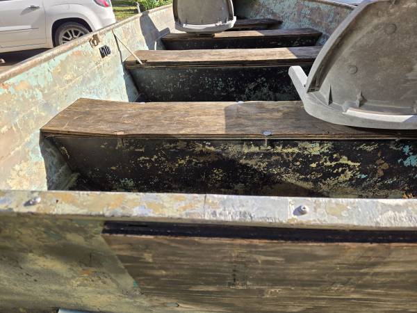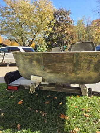 14ft 1977 Crestliner, 20 Inch transom,62 Inches wide (Beam). Needs a new plug last time I took it out it the plug was leaking. Trailer was for snowmobiles but converted to haul a boat. No motor.