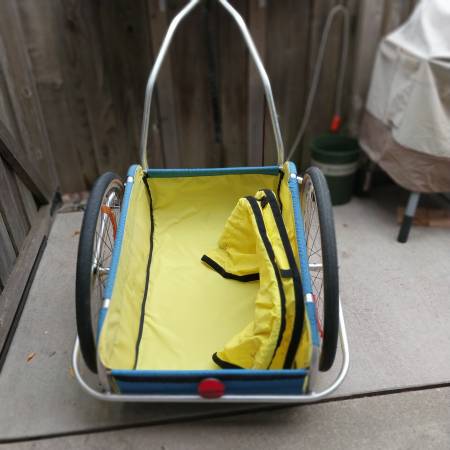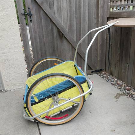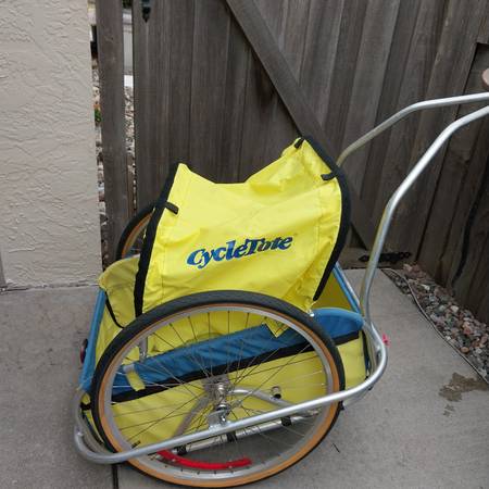 A Cycletote(made in America) doggy trailer for bicycle. This could also be used for hauling stuff. Two hitch options come with this trailer that hitch to the seat post. This is a sturdy metal framed trailer. All instructions are included. It has 26" tires. The inside dimensions are 21"x 30". It also has a small shade canopy attachment.