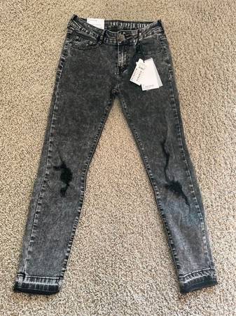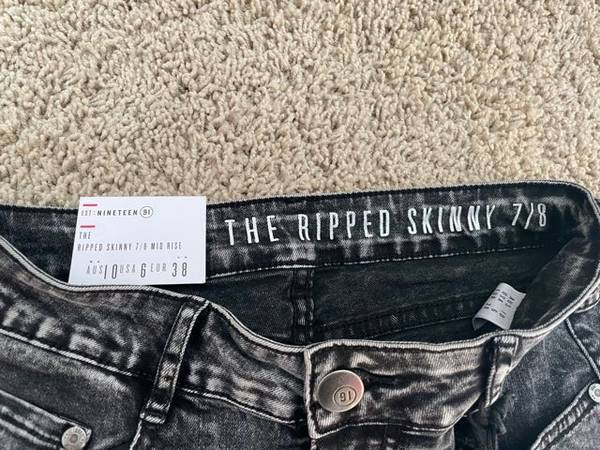 Black skinny ripped jeans size 7/8 midrise with frayed leg hem bought at Cotton:On store. New with tags on from a smoke-free, pet-free home. $30 cash only.