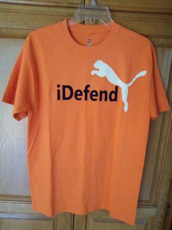 I Defend Orange Shirt size Medium - LIKE NEW - Hanes tagless shirt 60% cotton, 40% polyester from a smoke-free, pet-free home. $18 cash only.