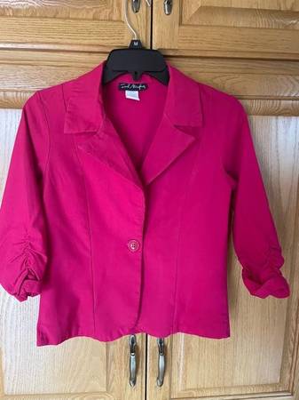 Hot Pink (Fuchsia) Blazer Jacket size Medium in very good condition from a smoke-free, pet-free home. Stretchy material with gathered 3/4 sleeves. $15 cash only.