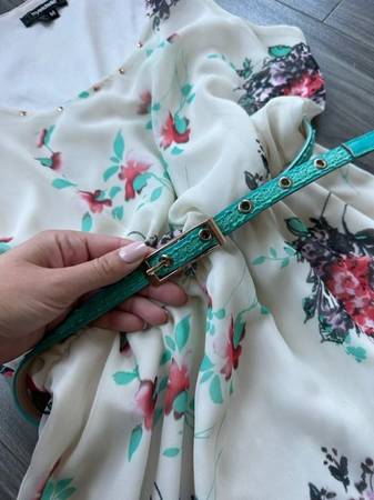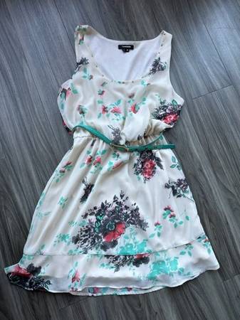 White Floral Dress Juniors size Medium from a smoke-free, pet-free home. My Michelle Brand, tank top style with belt, lined, 100% polyester. Hardly worn. $13 cash only.