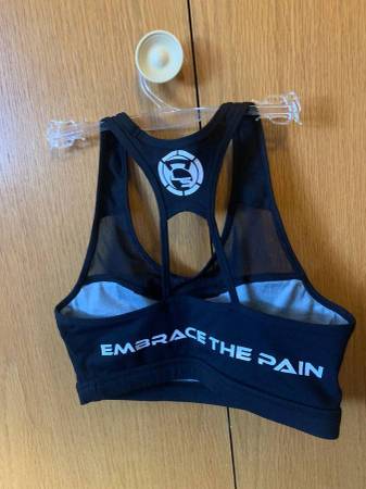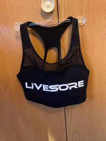 Livesore Black Sports Bra size Small in good condition from a smoke-free, pet-free home. Has slight discoloration on the first E on the front. $10 cash only.