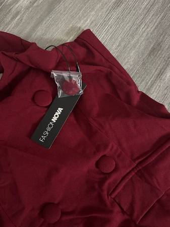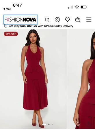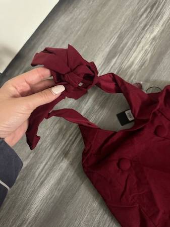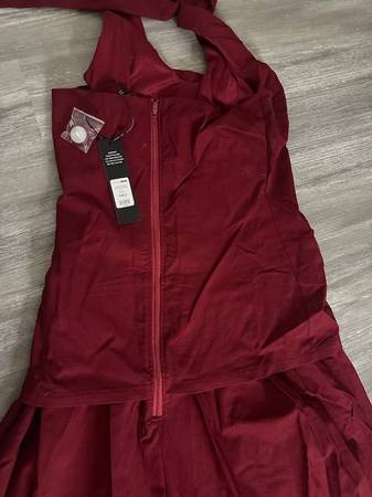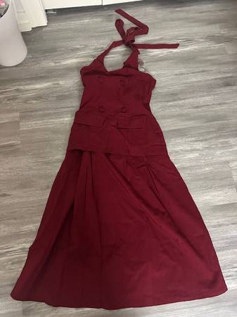 Maroon Halter Dress - NEVER WORN - New with tags on from a smoke-free home. Size Medium, Burgundy Color, Fashion Nova Brand, Twill Midi Dress, Halter Top, Faux Button, Faux Pockets, Drop Waist, Pleated, Back Zipper, Stretch, Length Measured Flat = 40", 60% Rayon 35% Nylon 5% Spandex. I included a picture of it on the website. $35 cash only.