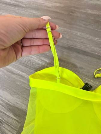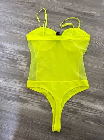 Neon Yellow Bodysuit from a smoke-free home. Size Small, Forever 21 Brand, Adjustable Spaghetti Straps, corset style, mesh back, stretchy material. $12 cash only.