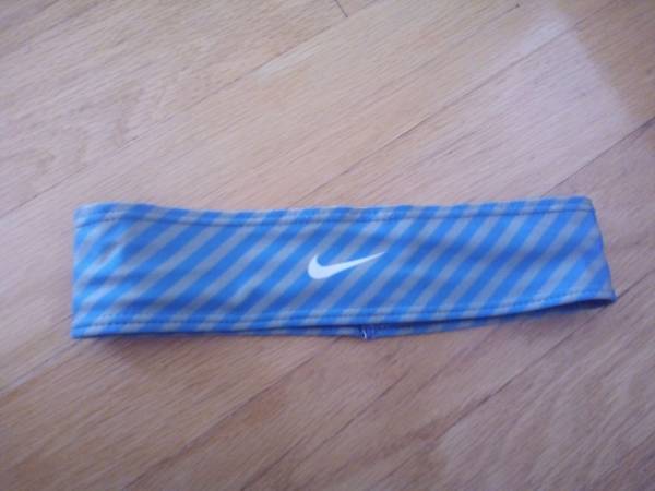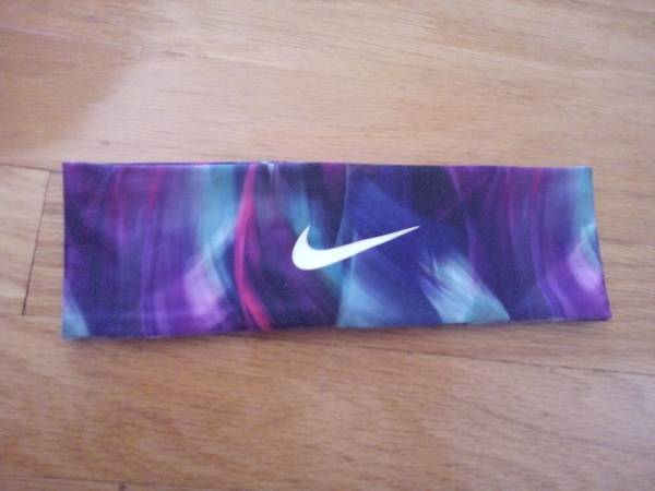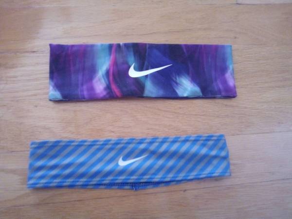 Nike Headbands in like-new condition from a smoke-free, pet-free home. Multi-colored one is 2 3/4 inches wide with rubber grips on the inside to hold it in place. The striped one is 2 inches in the front and tapers to the back. For both of the headbands, $15 cash only.