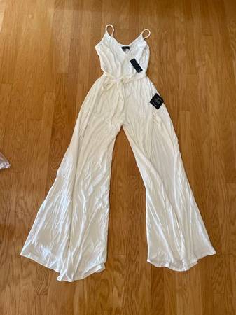 White Jumpsuit with Thigh-high Slits Size Medium - NEW with tags on - from a smoke-free, pet-free home. Just Breathe White Sleeveless Slit-Leg Jumpsuit from Lulus. Stretchy Fabric, inseam measures about 33 inches, front rise measures about 13 inches, v-neck, spaghetti straps, wide pants legs with thigh-high slits, tying sash, Style 427982, jersey knit fabric - 95% Rayon Modal and 5% Spandex. $50 cash only.