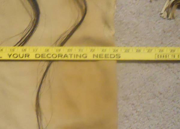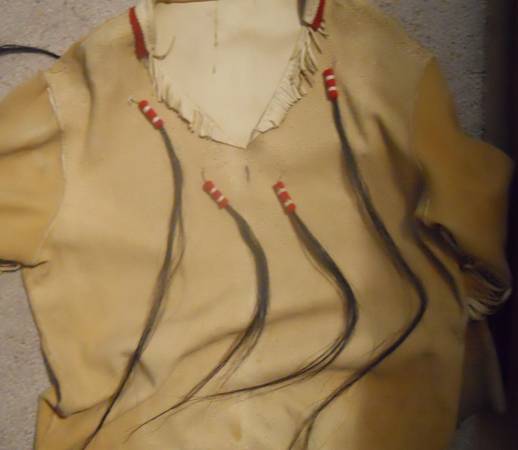 AS PICTURED A VINTAGE HAIR DECORATED BUCKSKIN SHIRT, I ESTIMATE IT TO BE AN XL-T............I HAVE PLACED A RULER ON IT TO SHOW DIMENSIONS AS CLOSE AS I COULD...........IT IS REVERSED EITHER DEER OF...