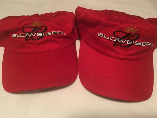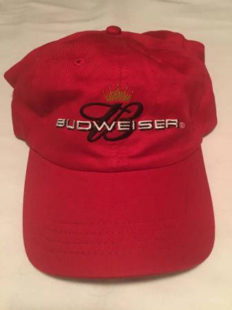 NEW RED BUDWESIER CROWN LOGO ADJUSTABLE HATS. ONLY $5 EACH.