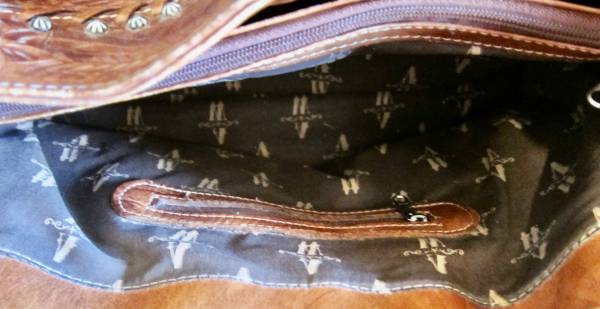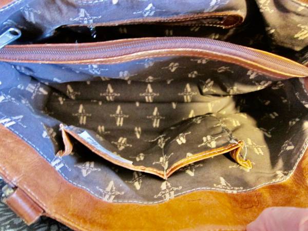 This handbag is in great, looks great, clean inside, good inside zippers, magnetic latch. Center zipper compartment, side compartment with 2 pouches, side compartment with smaller zippered compartment. Size: 11" strap hang, 9" tall, 14" long, 6" wide at bottom. Made in Paraguay. CASH ONLY