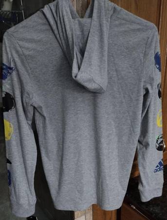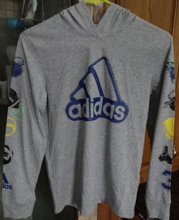 BRAND NEW!! (Tags still on!) Boys' ADIDAS Long Sleeve Gray background hooded sports emblems Shirt - Size Medium (10-12) From Non-Smoking Home **If you are reading this ad, this is available....