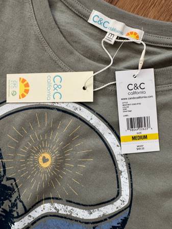The product is a C & C California women's short sleeve tee in size medium, featuring a graphic print with a California theme. The tee is a blend of 50% cotton and 50% polyester, making it a comfortable and breathable option for everyday wear. The color is described as dried sage, adding a unique touch to the overall design. Perfect for casual outings or lounging, this top is a stylish choice for women who appreciate quality and style in their clothing.
