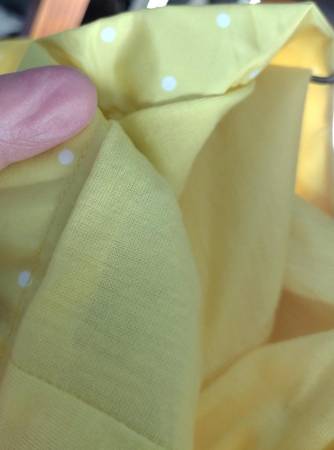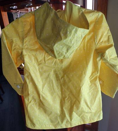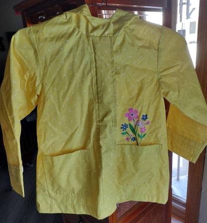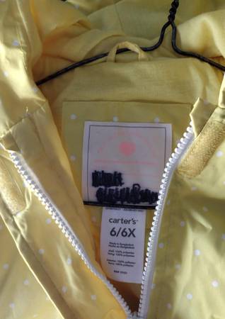 Adorable yellow polka dot rain jacketm by Carter's, for a little girl who wears size 6 or 6X. Zippered and snap front, two front patch pockets, hood which has soft fabric inside, and snaps on sleeve cuffs. Flowers look like they are growing right out of the pocket!!